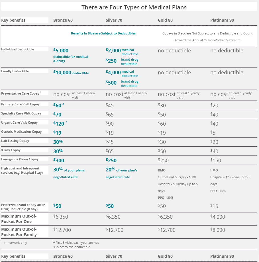 Family Deductible This is amount the entire family combined will have to pay before the insurance covers any of the services listed in Blue on the Medical Plans Chart located at top of this page. The deductible requirement will be waived for all members in the family once two or more people in the family have combined to satisfy this amount. For example, if Mom & Dad both reach their individual deductible amounts ($5,000 each = $10,000 combined) under the Bronze plan, then their children will not have to meet any deductible and will only have to pay the copay amounts listed in Blue on the Medical Plans Chart. Also, if only one person in the family meets their individual deductible, that person will still have satisfied their deductible and the insurance will cover any of the services listed in Blue on the Medical Plans Chart for this person only.